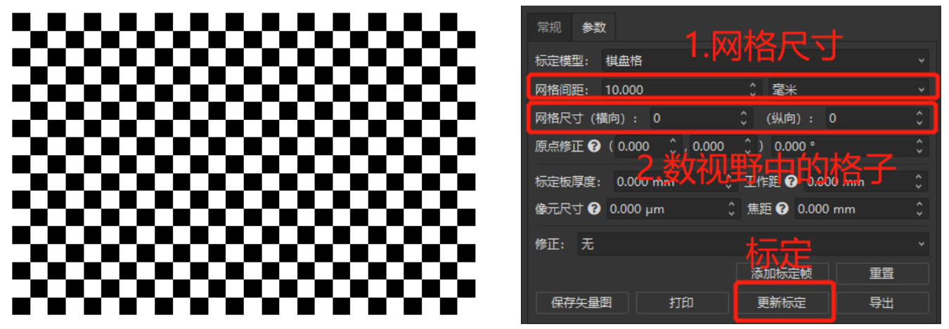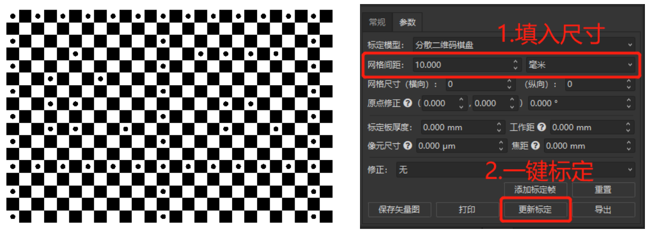 通過(guò)市場(chǎng)需求的調(diào)研,我們發(fā)現(xiàn)圖1中傳統(tǒng)棋盤格標(biāo)定的流程比較復(fù)雜,用戶除了需要知道網(wǎng)格的尺寸以外,還要通過(guò)數(shù)的方式確定在相機(jī)視野中的網(wǎng)格數(shù)量來(lái)完成標(biāo)定,如果實(shí)際應(yīng)用場(chǎng)景中網(wǎng)格間距尺寸比較小,用戶很可能數(shù)錯(cuò)導(dǎo)致最后標(biāo)定失敗。