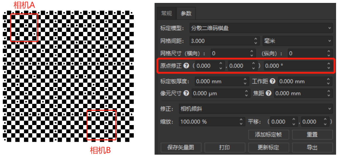如上圖所示,用戶通過(guò)輸入網(wǎng)格間距、尺寸、原點(diǎn)修正等信息,可以將多個(gè)相機(jī)標(biāo)定在同一坐標(biāo)系內(nèi),實(shí)現(xiàn)多個(gè)相機(jī)的聯(lián)合標(biāo)定,從而計(jì)算出兩個(gè)相機(jī)內(nèi)任意兩點(diǎn)或者其他特征的距離。