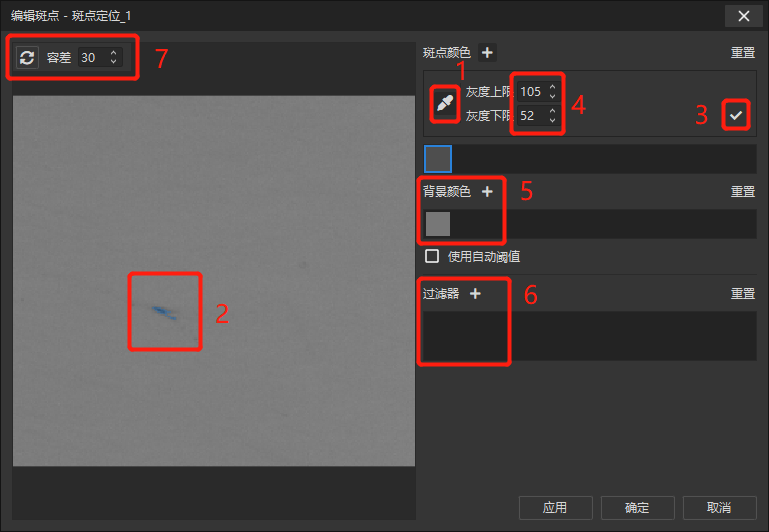然后在參數(shù)欄打開斑點(diǎn)配置界面,用戶可以按照以下步驟完成斑點(diǎn)提取,順序與圖中的序號(hào)一一對(duì)應(yīng):