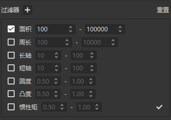 6.斑點(diǎn)過濾器配置如圖4所示,用戶可以通過這個(gè)過濾器過濾不符合標(biāo)準(zhǔn)的斑點(diǎn),可選的參數(shù)有面積、周長(zhǎng)等