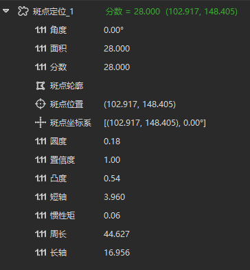 在提取到斑點(diǎn)后,靈閃會(huì)輸出斑點(diǎn)的相關(guān)算法結(jié)果來作為相關(guān)檢測(cè)的依據(jù),例如把面積的大小作為缺陷判斷標(biāo)準(zhǔn)的依據(jù),通過斑點(diǎn)位置進(jìn)行缺陷區(qū)域的切割等,具體算法結(jié)果如圖6所示。