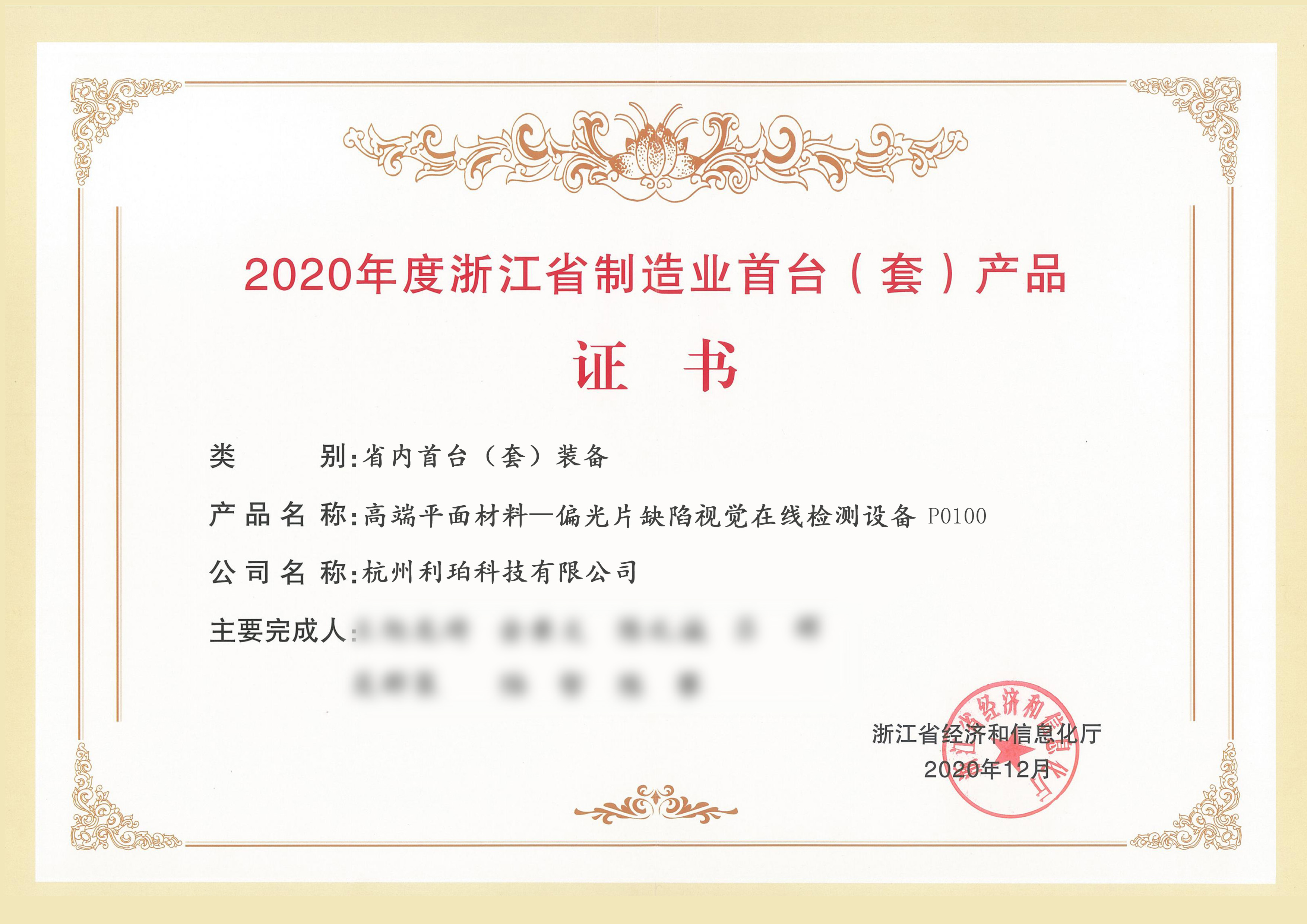 2020年度浙江省制造業(yè)首臺(套)產(chǎn)品證書-省內(nèi)首臺套裝備...