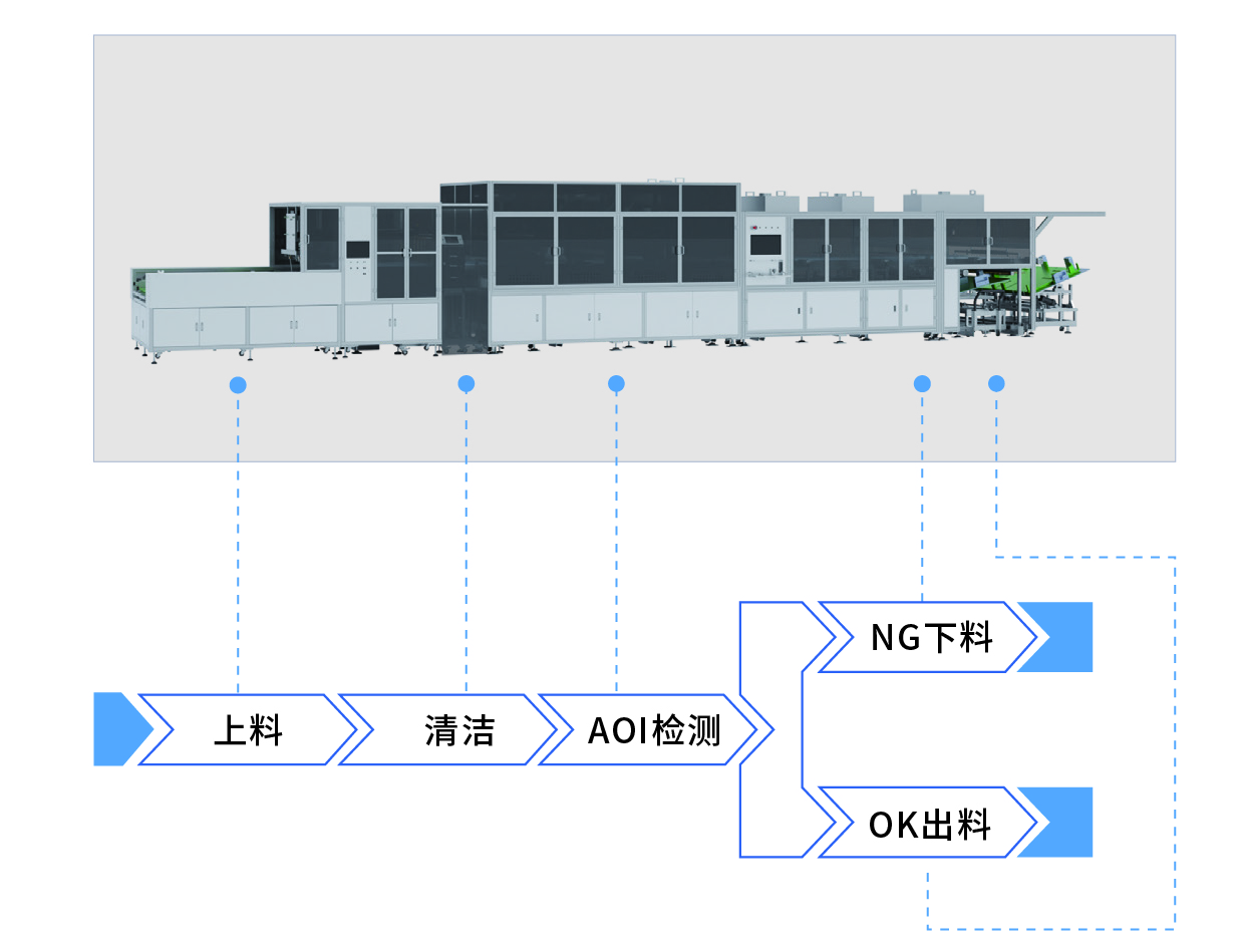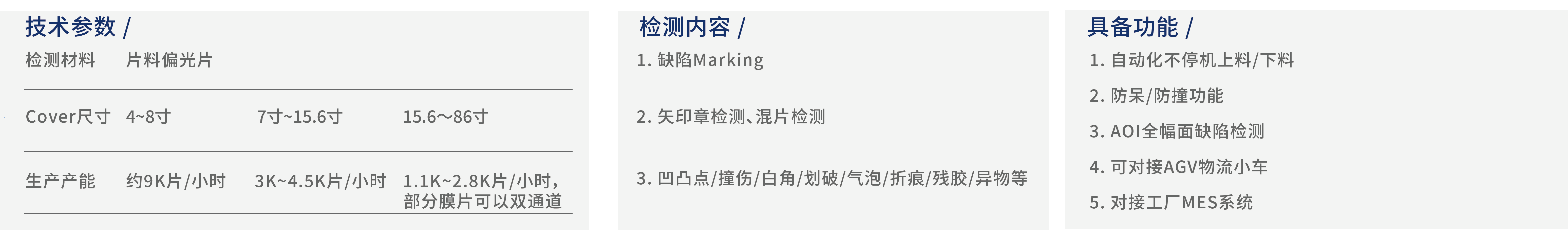 設(shè)備用于偏光片的檢測,采用自動上下料以及特制輸送結(jié)構(gòu),搭配自研AOI檢測軟件,對矢印章、缺陷打標Mark、異物、氣泡、劃傷、凹凸點、折痕、撞傷、殘膠、臟污等缺陷進行精準檢測以及OK/NG分流,把控出貨產(chǎn)品質(zhì)量。